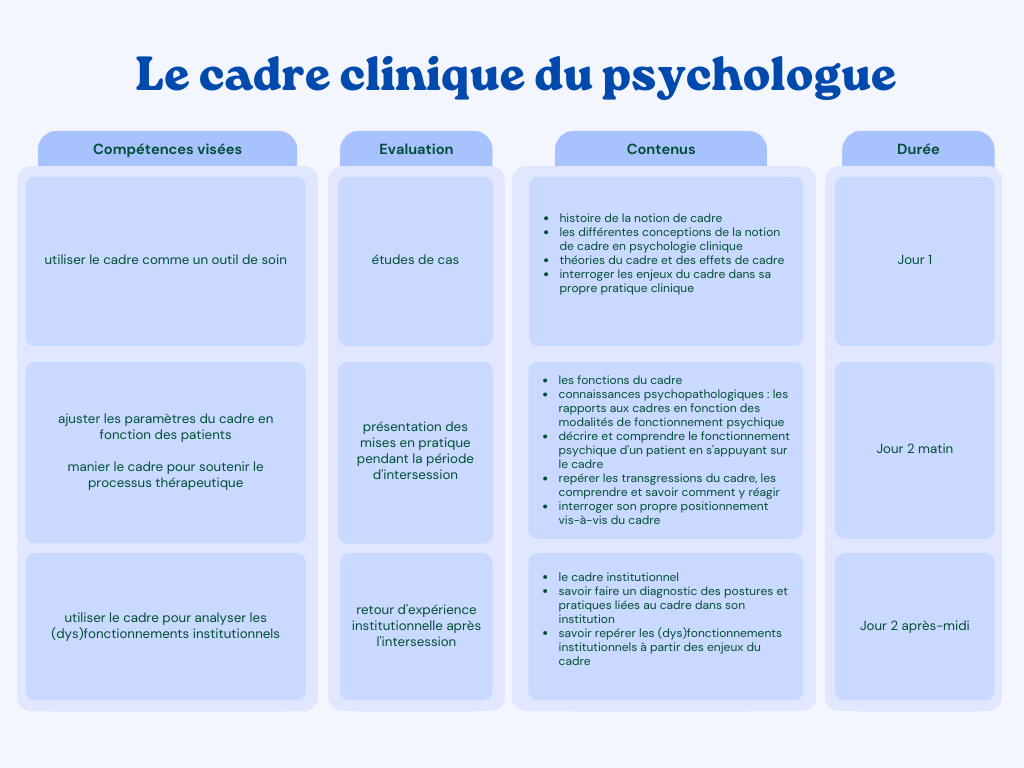 Les psychologues sont souvent intéressés par les enjeux du cadre dans leur pratique, et la manière de s'y appuyer pour accompagner les patients, mais ils y sont souvent peu formés.